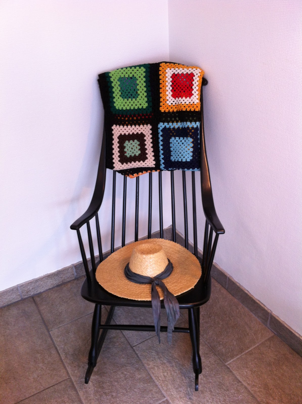 En ældre sortmalet gyngestol med et 100% ægte mormor tæppe.